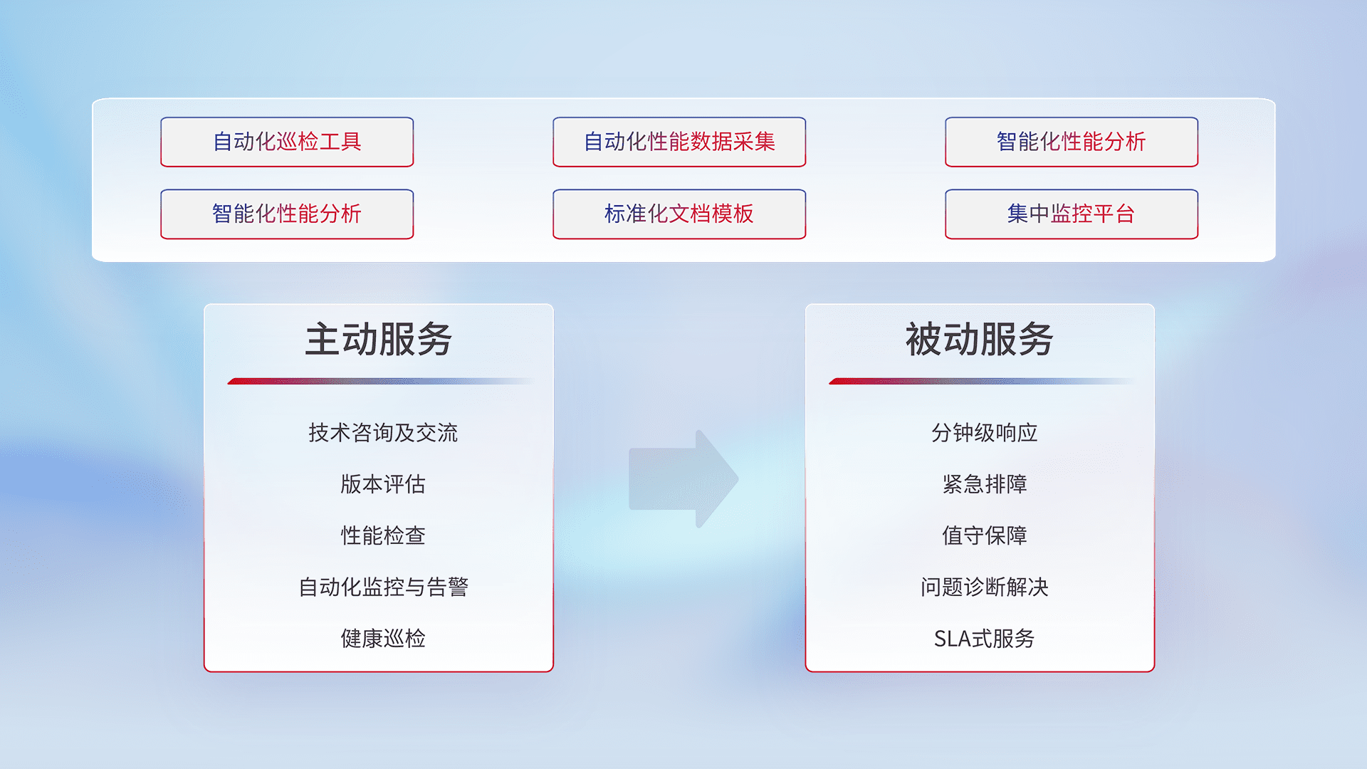 智能化工具和标准化文档,,,,保障服务质量,,提供主动服务(包含技术咨询、、、版本评估、、性能检查、、自动化监控与告警、、、健康巡检)和被动服务包含(分钟级响应、、紧急排障、、、、值守保障、、问题诊断解决、、、、SLA服务)。。